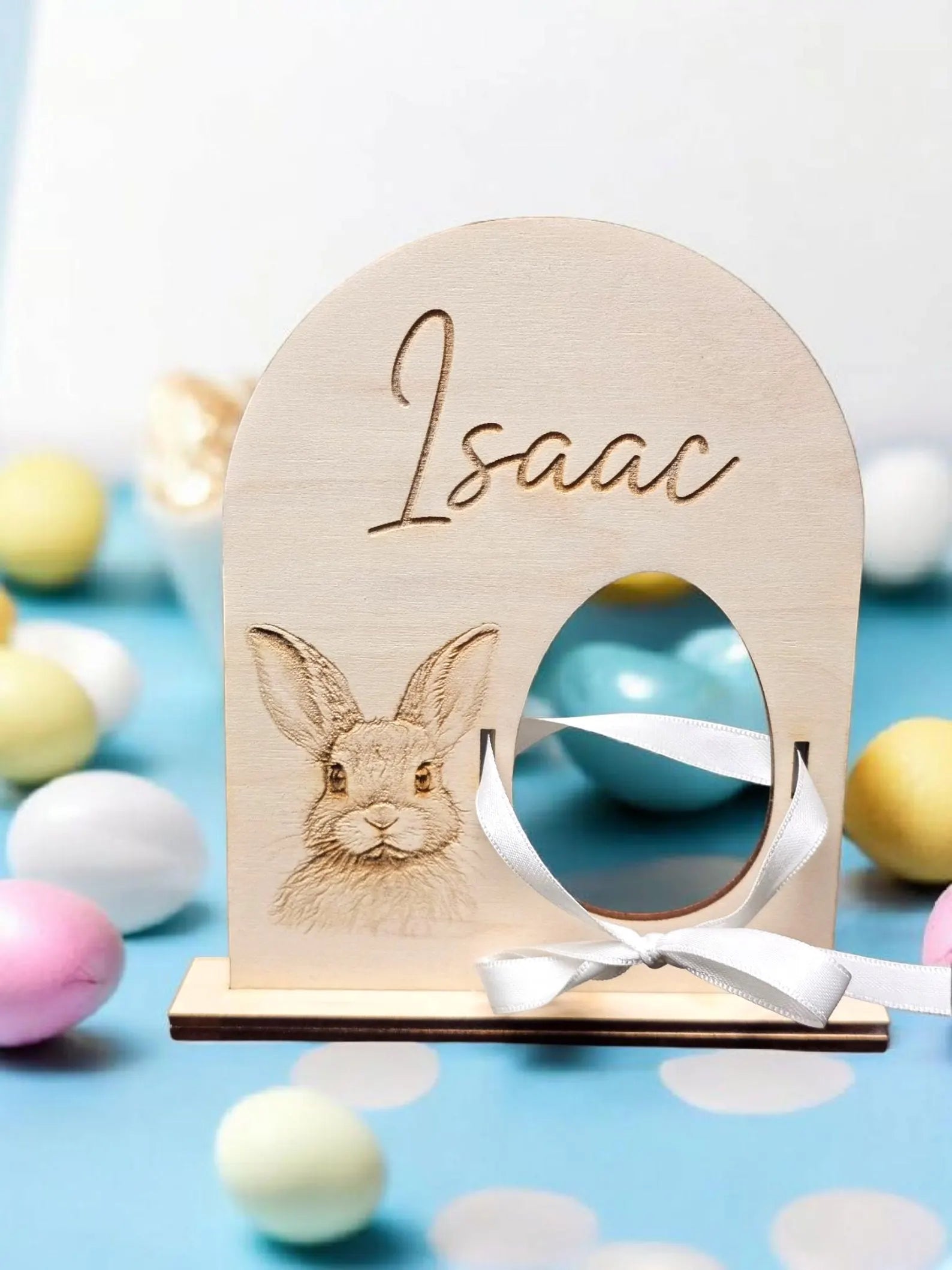 Charming freestanding bunny egg holder crafted from maple wood, designed to display and hold standard chocolate surprise eggs. Each piece is personalised with your chosen name, making it an ideal Easter gift or egg hunt accessory. The adorable bunny design adds festive charm to any Easter celebration or display. Perfect for creating memorable moments during Easter festivities. Please note: chocolate eggs not included.