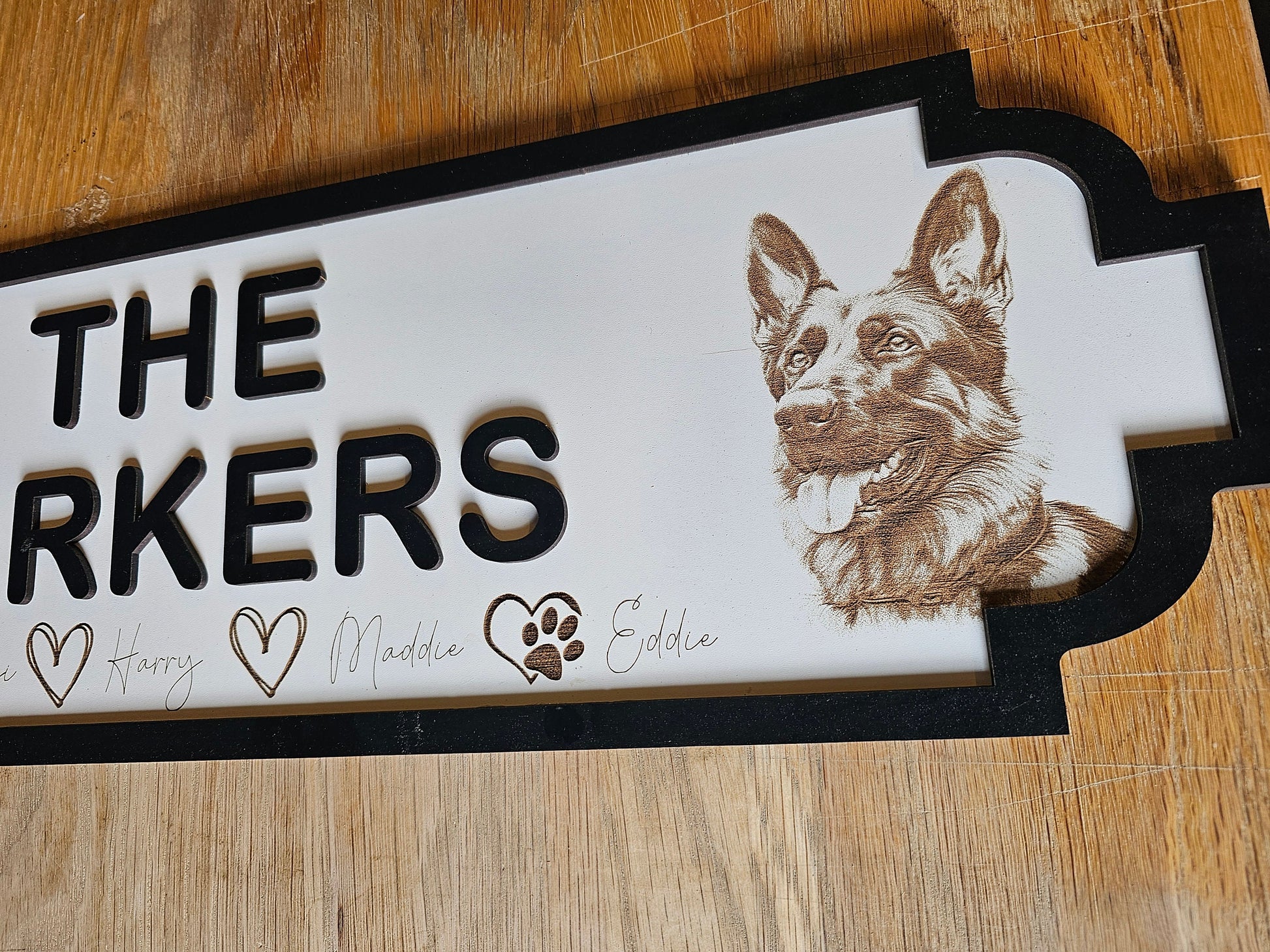 stree sign is personalised with family name and family members including you fur baby, each name is separated with a heart or paw print and heart if your beloved pet.