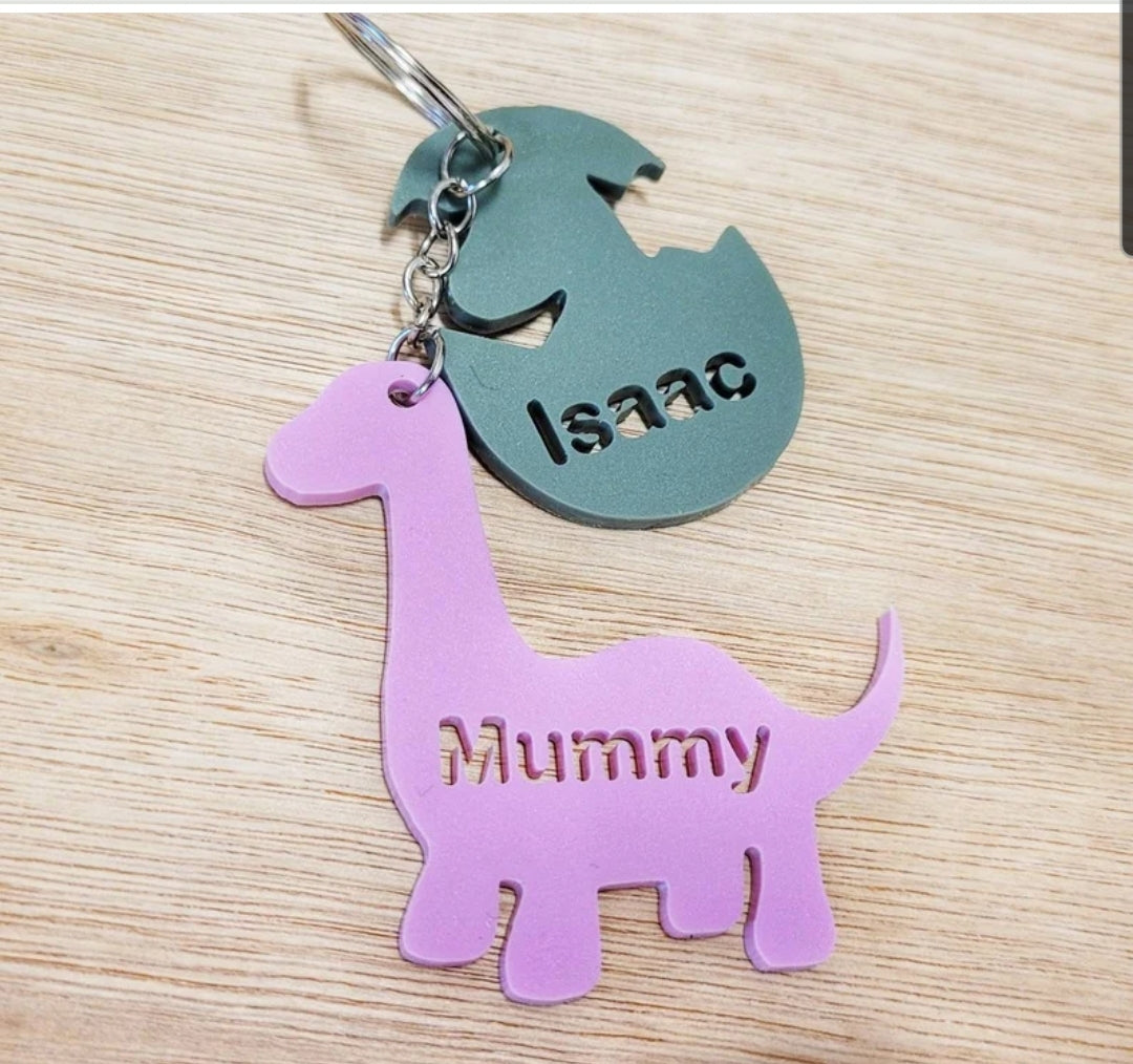 Personalised keyring in the shape of a dinosaur with hatching egg/s
